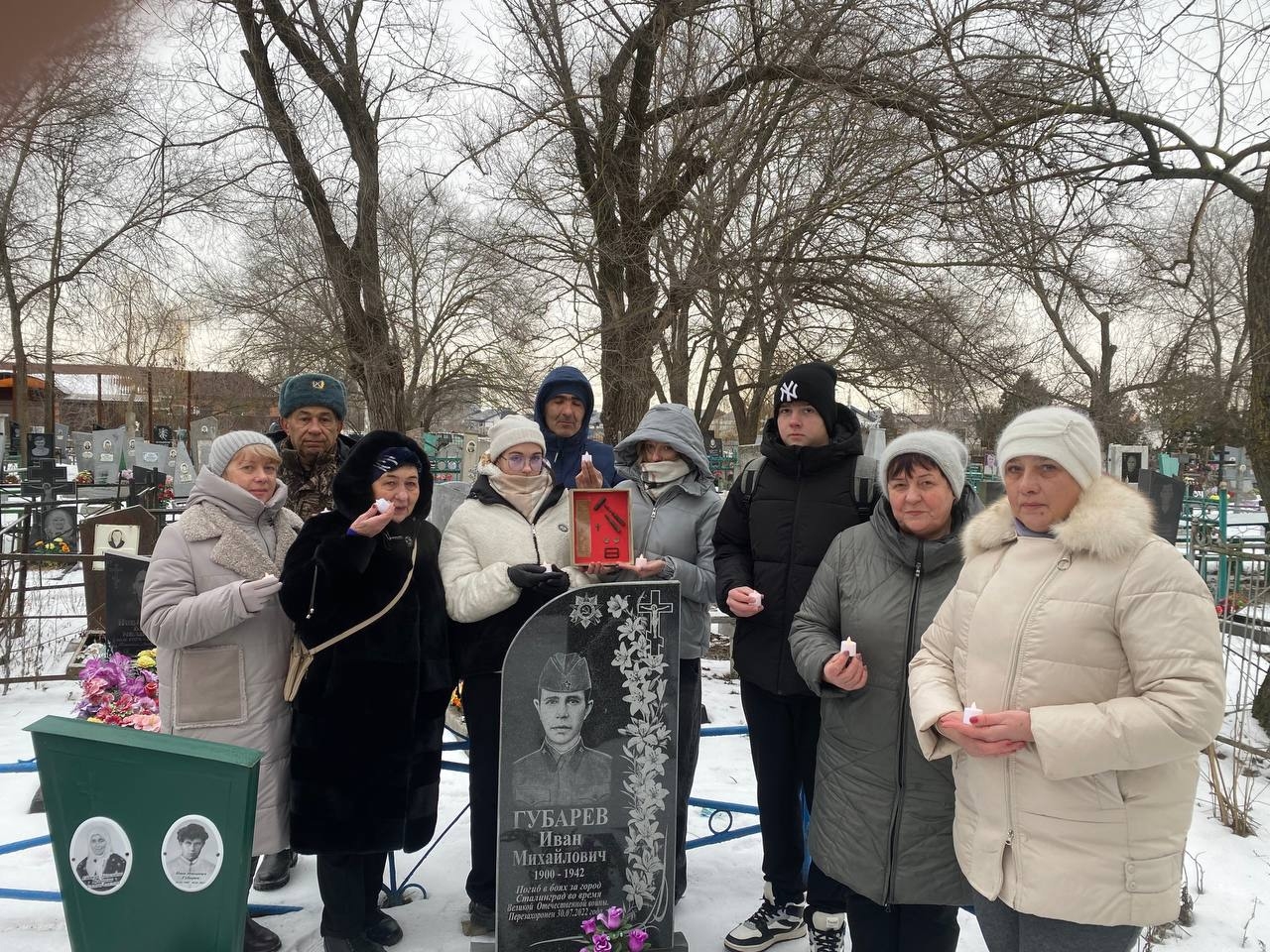 Сегодня, 2 февраля, в годовщину победы в Сталинградской битве, представители клуба «Поиск» школы №5 , библиотеки им. А. П. Чехова, совместно с родственниками возложили цветы к могиле солдата-участника той легендарной битвы.
